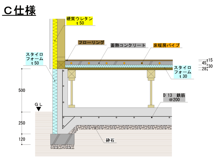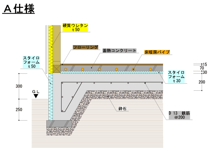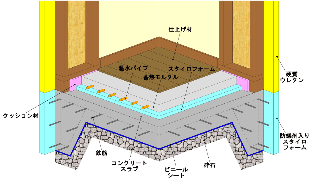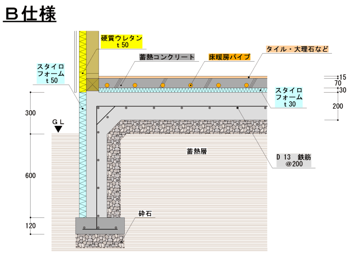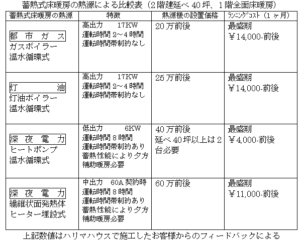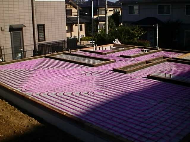 大気熱を利用したヒートポンプ式ボイラー(COP 3.73)を深夜電力で運転して夜間に床蓄熱する床暖房です。1階床全面床暖房配管を行い、居間はもちろん浴室やトイレ、廊下も24時間暖かく快適です。 床暖房は太陽熱と同じ輻射熱で暖まるので体の芯まで暖かく快適です。しかし今までのパネル式床暖房ではランニングコストが高く、エネルギーを使いすぎていました。この蓄熱式床暖房システムでは、厳冬期1ヶ月の電気代が約¥4,000-です。