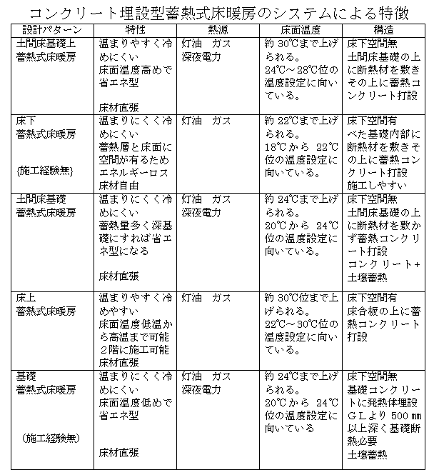 最近新築住宅に入居された方より「某メーカーで蓄熱式床暖房を採用したのですが暖かくありません」 このような相談が寄せられました。暖か過ぎる場合は運転時間を短くすれば解決しますが、暖かく感じない場合は連続運転するしかありません。 満足する暖かさは、床面温度で20℃~30℃までの個人差があり、御家族の好まれる床面温度を確認され、蓄熱式床暖房のシステムを選択する必要があります。一般的には室温が21℃前後で、床面温度は24℃~28℃位が好まれています。 注1 朝夕2時間の運転で比較 注2 基礎断熱性能による蓄熱性能差有り 注3(施工経験無)私は施工経験有りませんが、施工者と入居者の話より推測しました