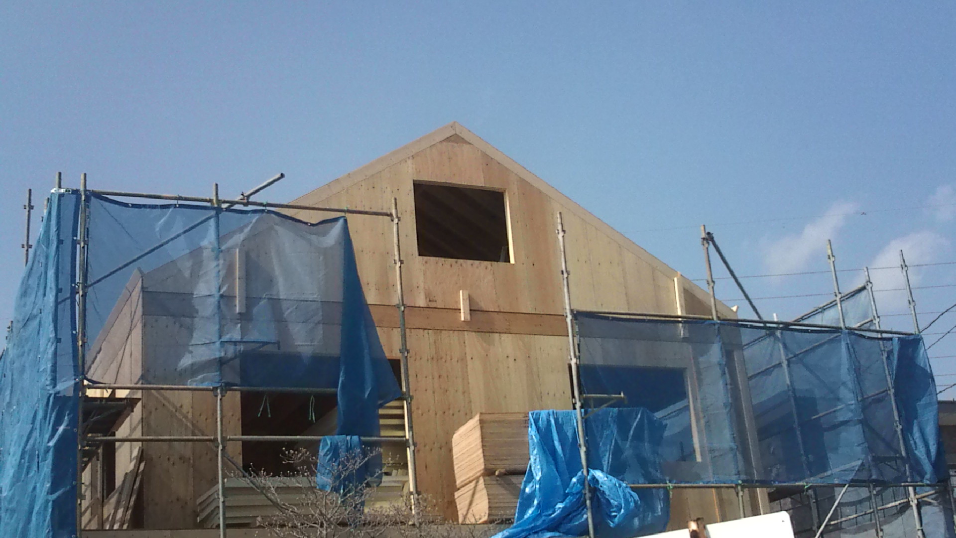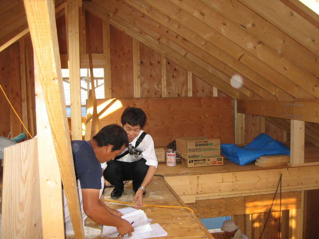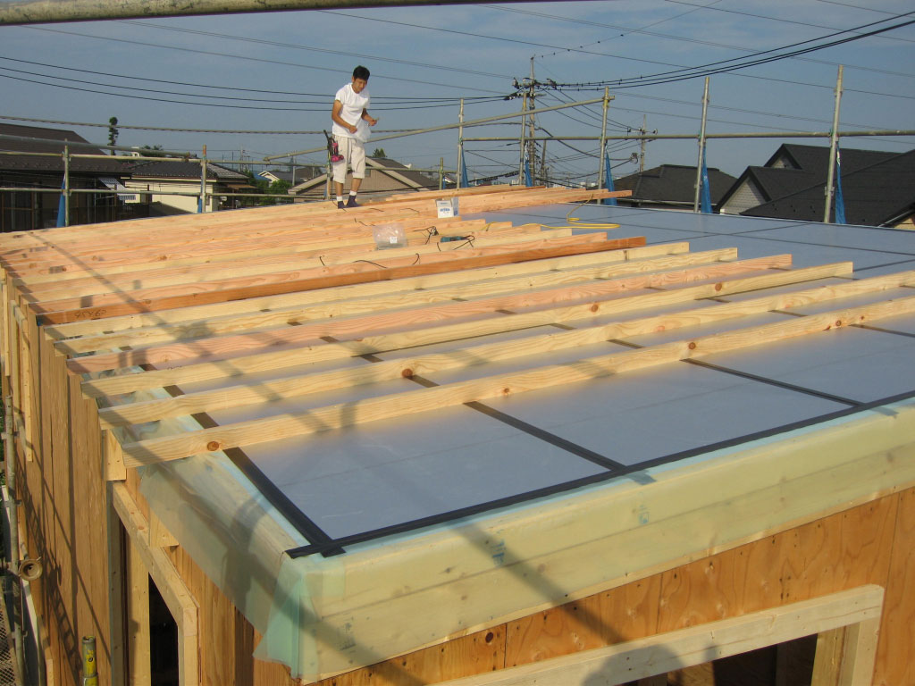 09,6,27 外張断熱材アキレスキューワンボード施工中 小原大工さん眩しそう。