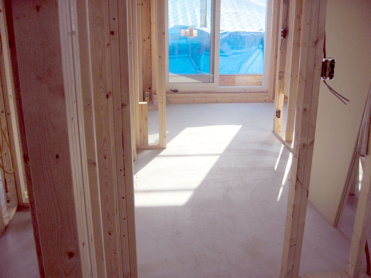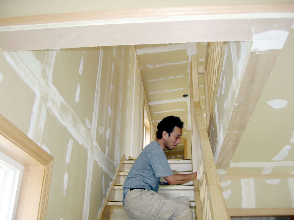 09,9,10 いつもお願いしている吉田クロスさんが珪藻土クロスを貼る下地の処理を行っています。