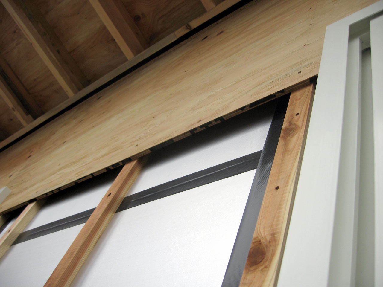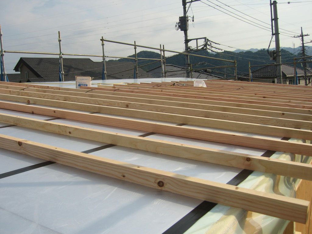 09,7,4 外張断熱材アキレスキューワンボード施工中 24㎜×45㎜の通気胴縁を打ち通気層とする。