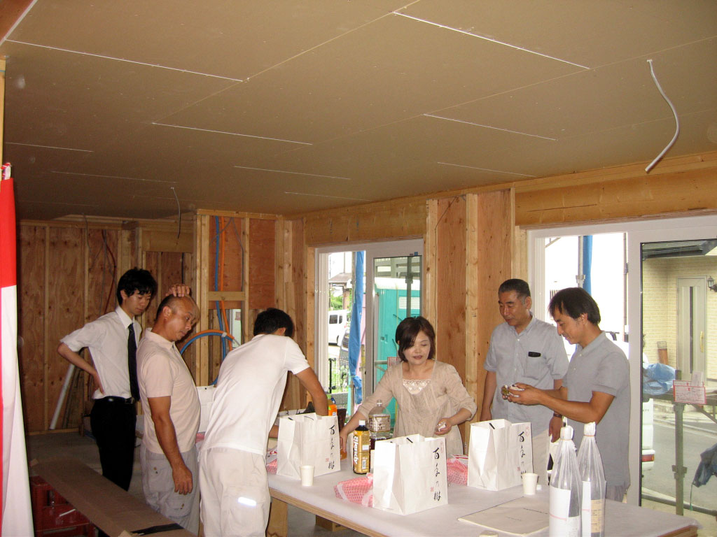 09,7,11 上棟式を開いて下さいました。W様ご夫婦と弊社から私と伊本社員、関山社員に小原大工、国知出大工で歓談いたしました。