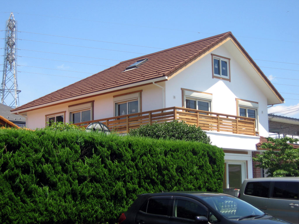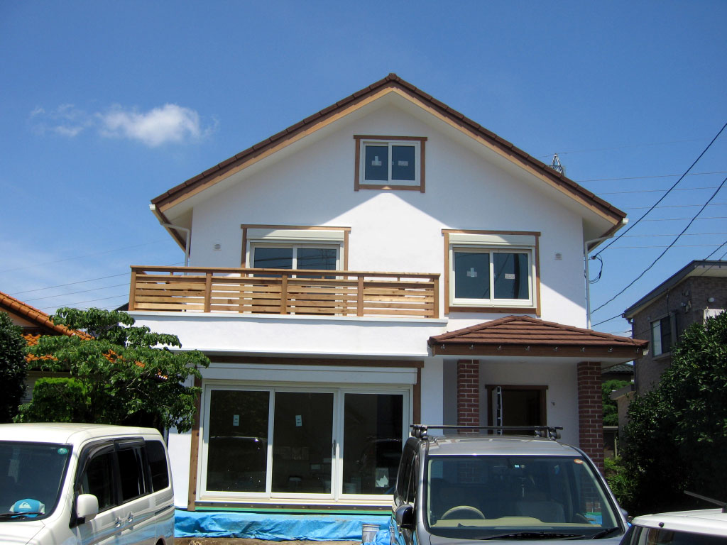 09,7,26 足場が取れました。スイス漆喰が白く輝いています。